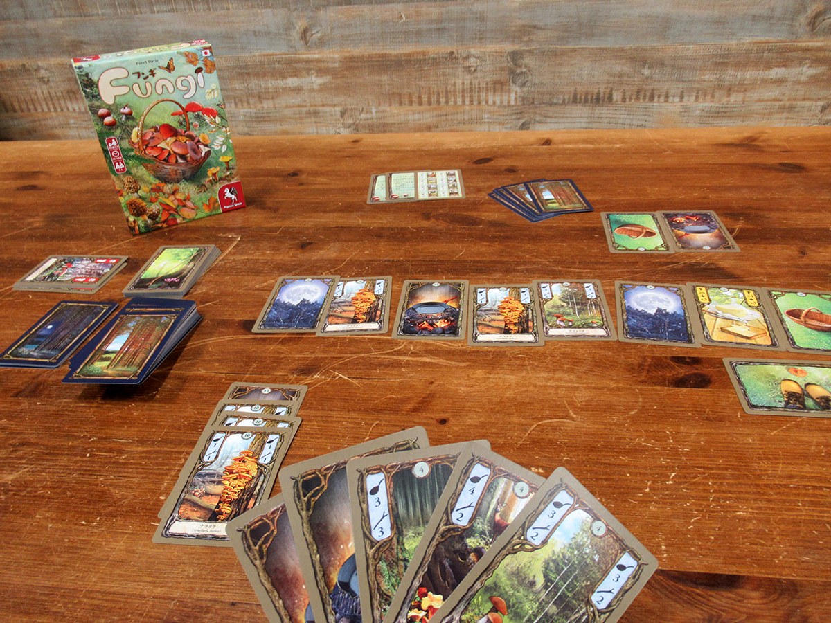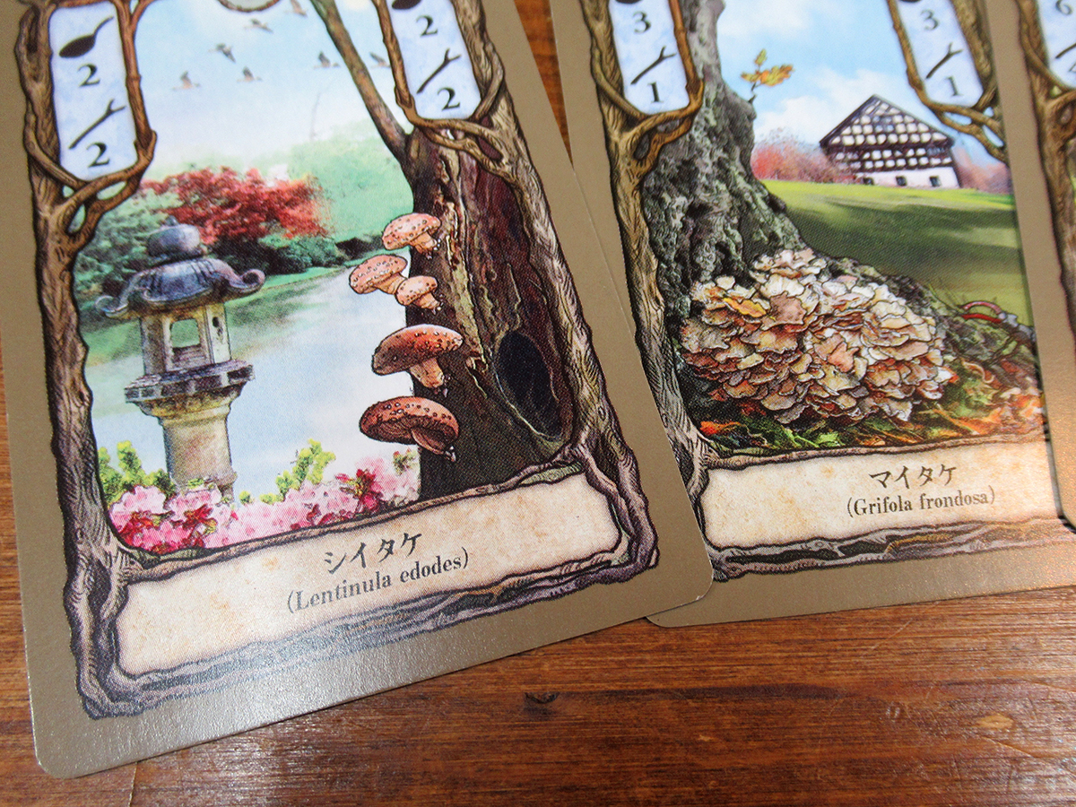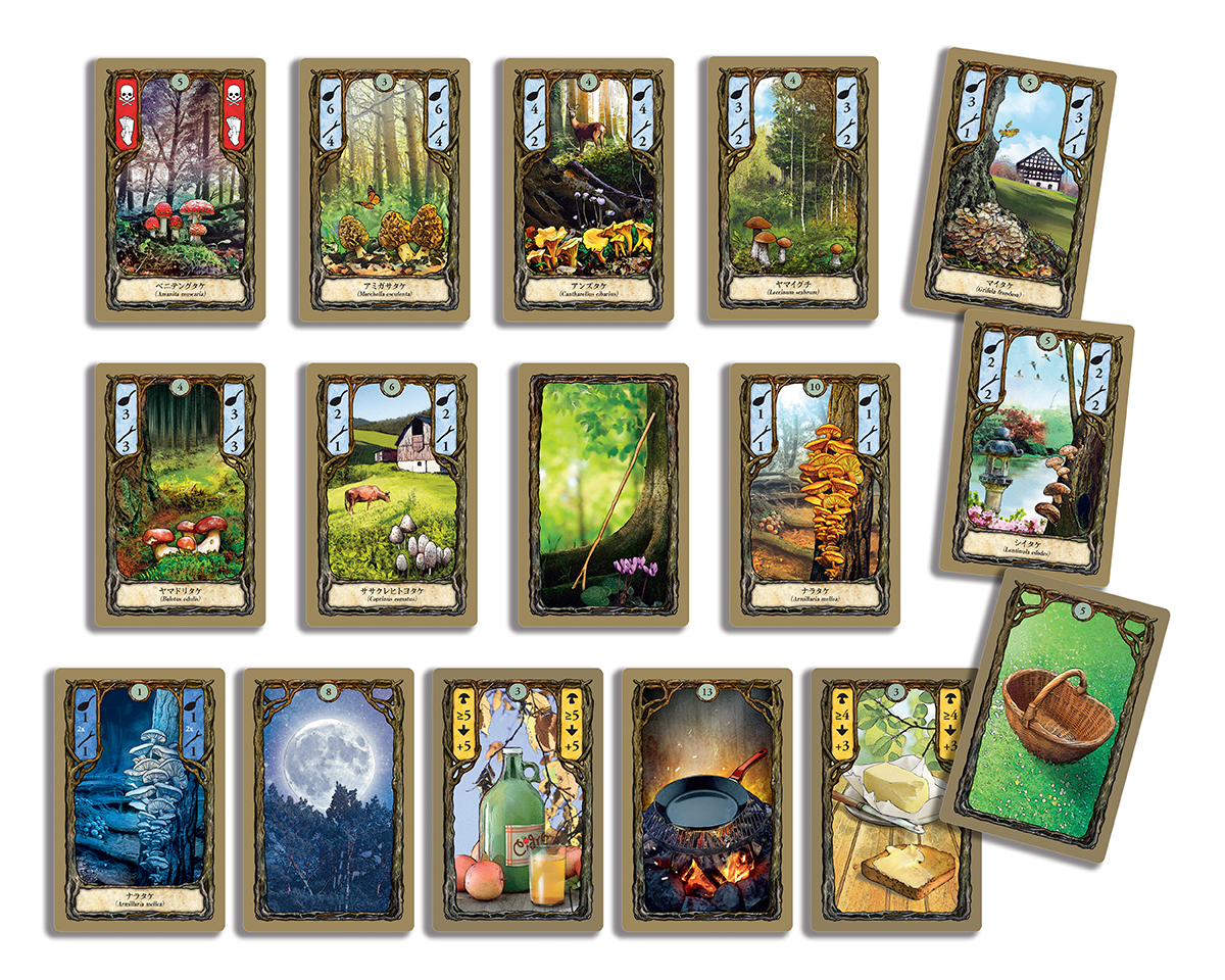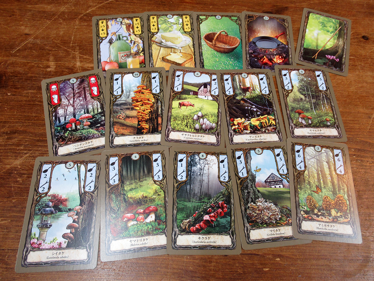「森」に登場するキノコは《ナラタケ》や《アンズタケ》、《マイタケ》、《シイタケ》など10種類。プレイヤーは山札から公開された8枚のカードからなる「森」のカードを取って、高得点を目指します。3枚以上同じキノコがあってフライパンが1枚あれば調理して得点にできますが、要らないのであれば2枚以上そろえて売却することもできます。売却したキノコは「杖」となり、この杖を支払って「森」のより奥のカードを採取できるようになります。